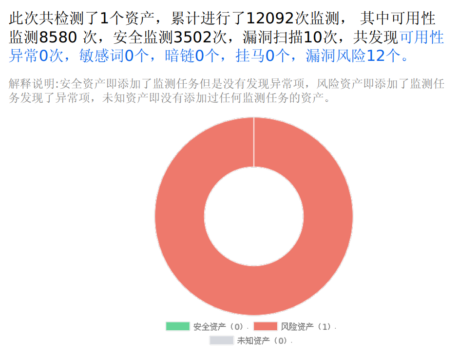 安全监测服务主要包括四方面内容,资产核查、可用性监测、脆弱性检测和完整性检测,其中资产核查服务主要帮助用户识别违规上线的应用,让用户对于外网暴露 IP、端口有一个全面的了解;可用性检测能够帮助用户了解其站点此时的通断状况,延迟状况;其次,脆弱性检测主要帮助用户检测其网站面临的安全风险,为其提供专业化的安全建议;再次,完整性监测能够为用户甄别出其站点页面是否发生了恶意篡改,是否被恶意挂马,是否被嵌入敏感内容等信息。