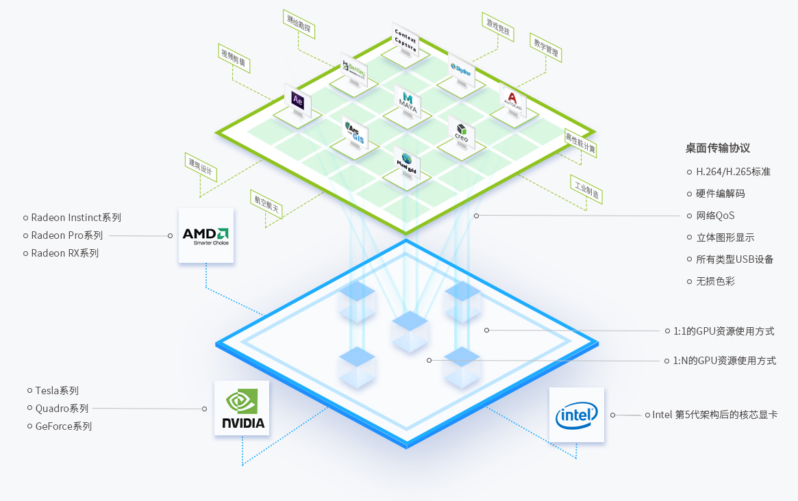 以超融合架构为基础的GPU云图形处理场景,通过GPU虚拟化技术,实现GPU资源配额灵活管理,从而应对高实时、高并发的海量计算场景,可满足重度图形渲染和数值计算,适用于测绘,勘探,建筑,设计,制造,影视,动画等行业。目前支持英伟达、AMD、英特尔等主流GPU。