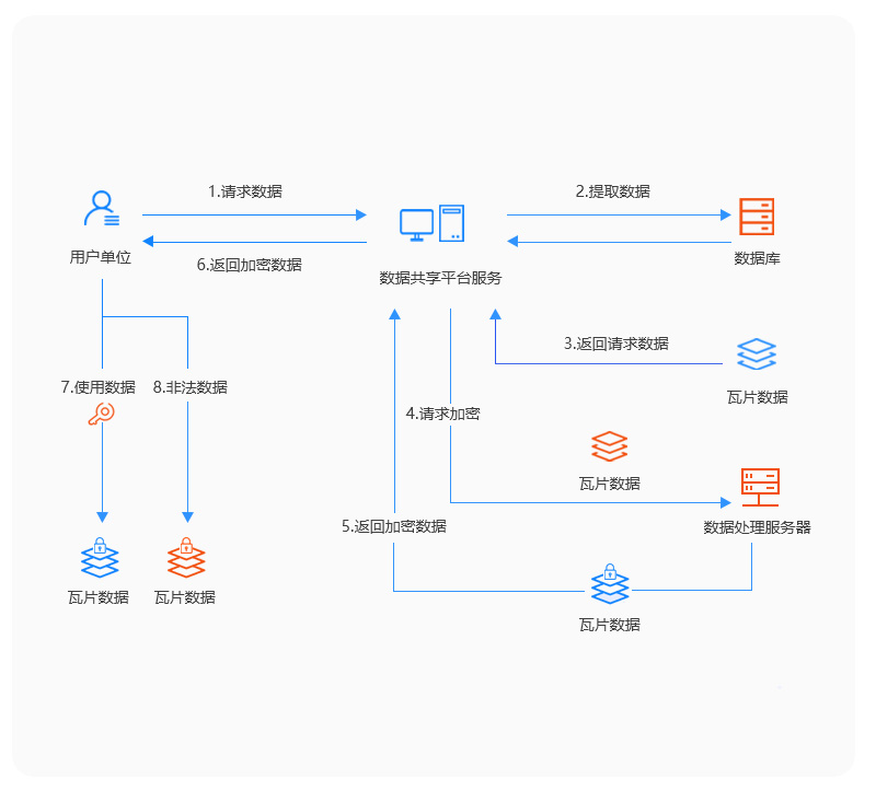对共享平台数据源进行集中加密处理,经过加密处理后的数据,均以加密状态在网络上传输。浏览端访问加密数据时,需要获取加密数据使用授权,成功获得了授权才能正常展示数据内容。