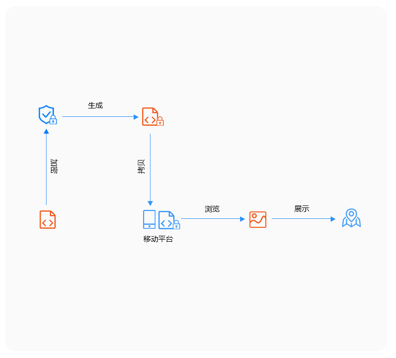 数据经过PC端加密后拷贝到移动设备,移动平台通过“移动安全组件”完成加密数据的展示。当移动App读取数据时,安全组件后台完成数据解析,支持App的正常使用数据。